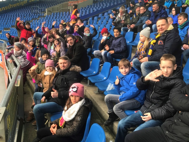 Die Fahrt ging zum Eintrachtstadion an der Hamburger Straße, wo unsere Reisegruppe um 13 Uhr von Herrn Scheil in Empfang genommen wurde. Die Kinder waren ganz aufgeregt, denn schließlich war ja heute eine Premiere. Zum ersten Mal würde unsere Grundschule im Rahmen der Löwenbande-Schul-Vereins-Partnerschaft ein Fußballspiel von Eintracht Braunschweig live im Stadion erleben können.