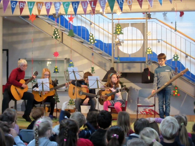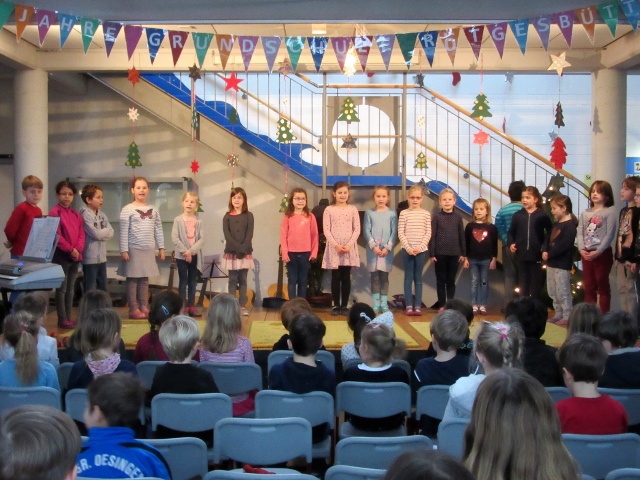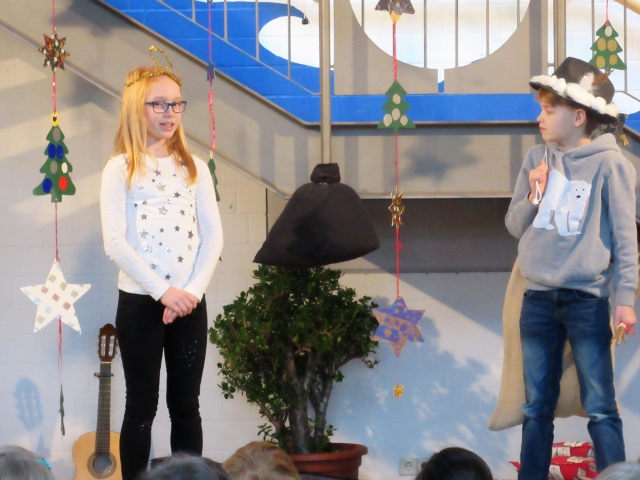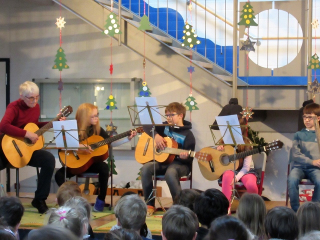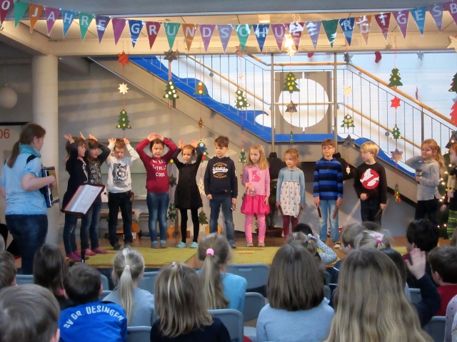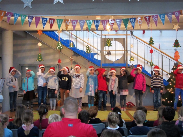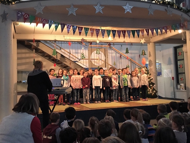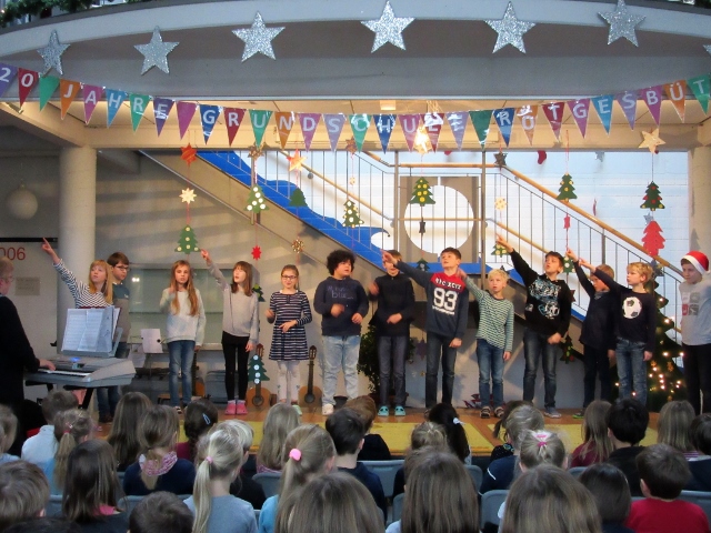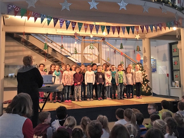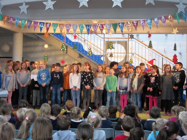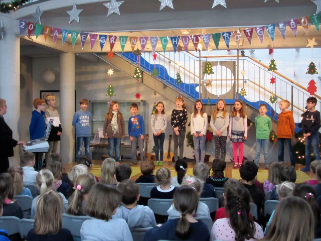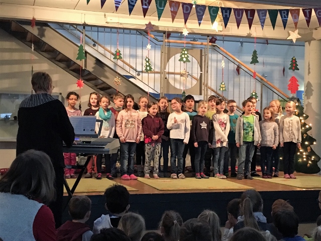 Der Chor, unter der Leitung von Frau Liebert, stimmte alle mit schönen Liedern auf die Weihnachtszeit ein. Jede Klasse hatte etwas für die Feier vorbereitet. Es wurden Lieder gesungen, Gedichte vorgetragen oder andere kurze Beiträge dargebracht. Auch die Gitarren-AG aus dem Ganztag bereicherte die Feier musikalisch und einzelne Kinder trugen Gedichte vor. Außerdem wurde natürlich ganz viel gemeinsam gesungen.