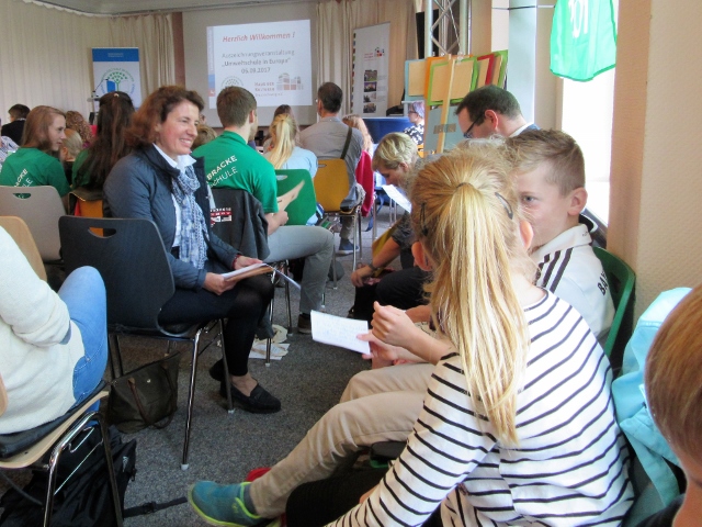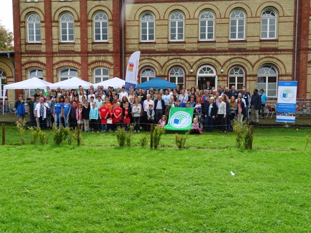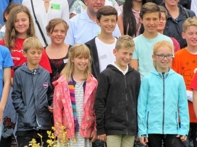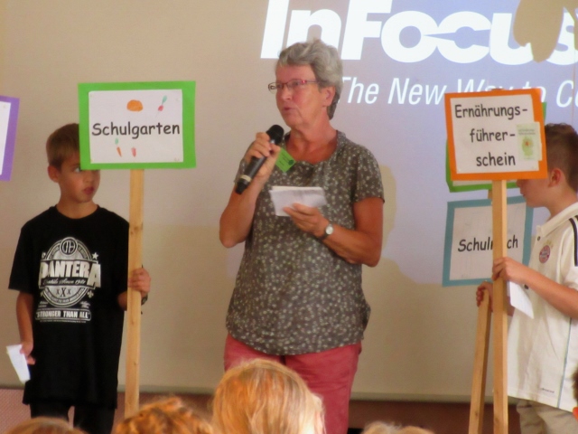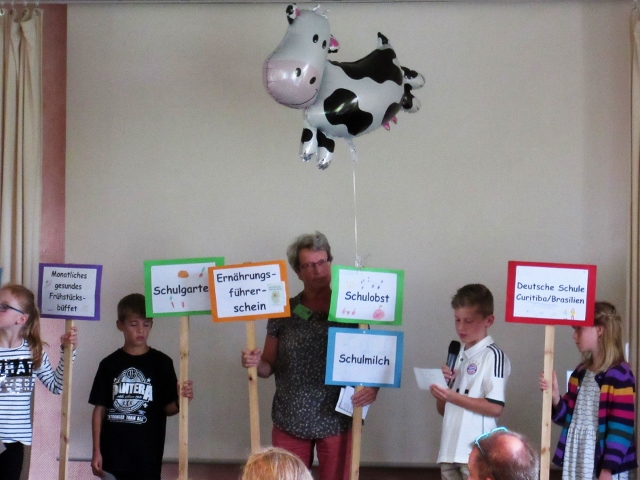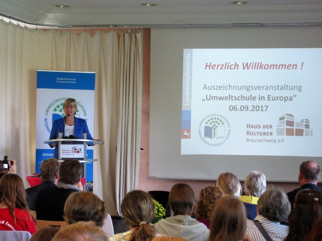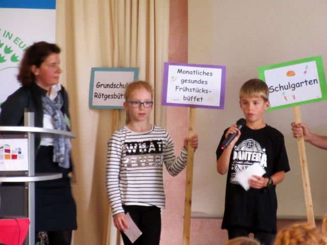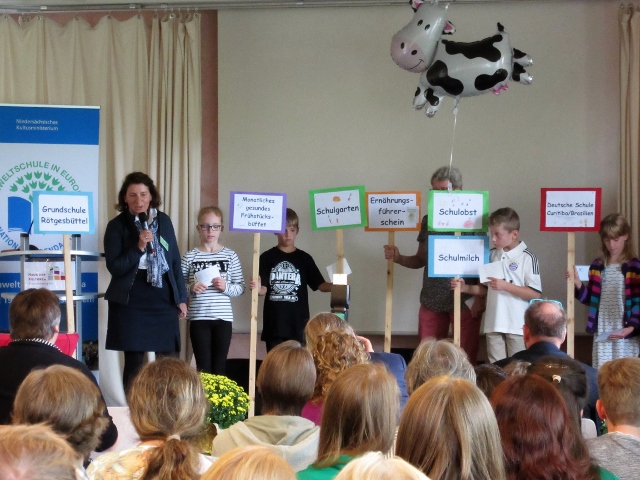 Am 06. September 2017 erhielt die Grundschule Rötgesbüttel in Anwesenheit der Kultusministerin zum fünften Mal die Auszeichnungen „Umweltschule in Europa“ und „International Eco-School“. Unsere Viertklässler Lea, Simon, Arne und Sina waren zusammen mit Frau Schöniger und Frau Schramm sowie der „Schulmilchkuh Milli“ zur Auszeichnungsveranstaltung nach Braunschweig gereist. Dort berichteten sie über unsere Teilprojekte zur gesunden Ernährung. Die Vorträge über das gesunde monatliche Frühstücksbuffet, den Ernährungsführerschein, den Schulgarten, das wöchentliche Schulobst, die Schulmilch und den Schüleraustausch mit Curitiba/Brasilien im 10. Jahr hatten unsere Schüler stichwortartig auf Karteikarten vorbereitet. Alle diese Teilprojekte, die auch  in unserem Schulprogramm und schuleigenen Curriculum verankert sind, fanden viel Interesse und die Zuhörer waren von der Darbietung begeistert. Unsere Viertklässler bekamen ein großes Lob, weil sie sich so engagiert hatten und auch den anderen Vorträgen aufmerksam folgten.