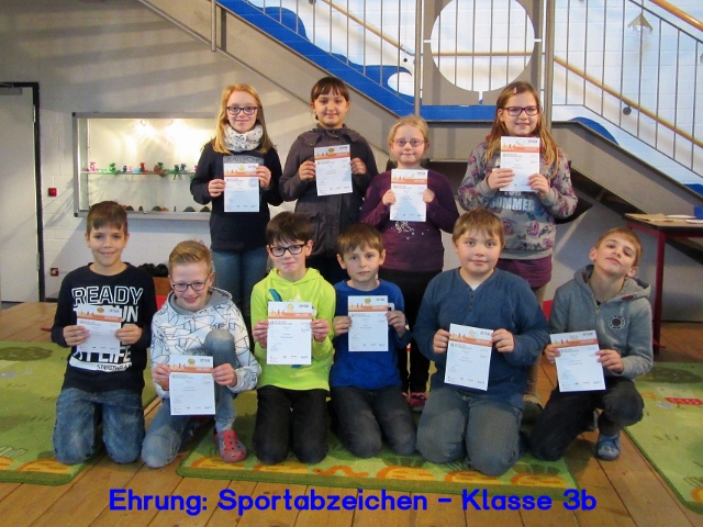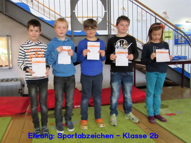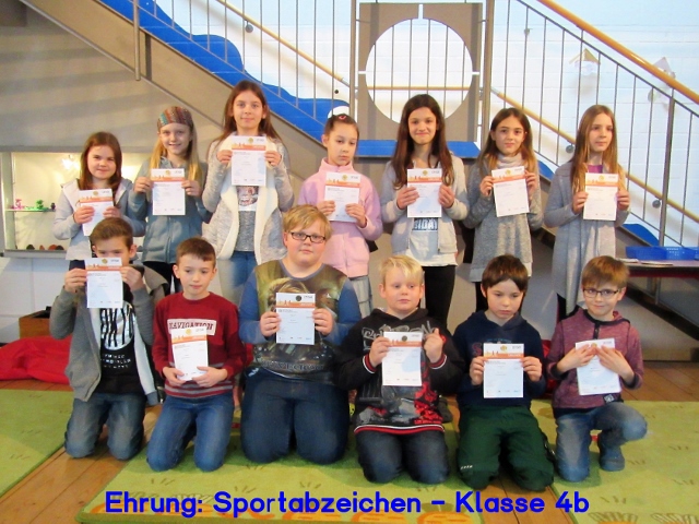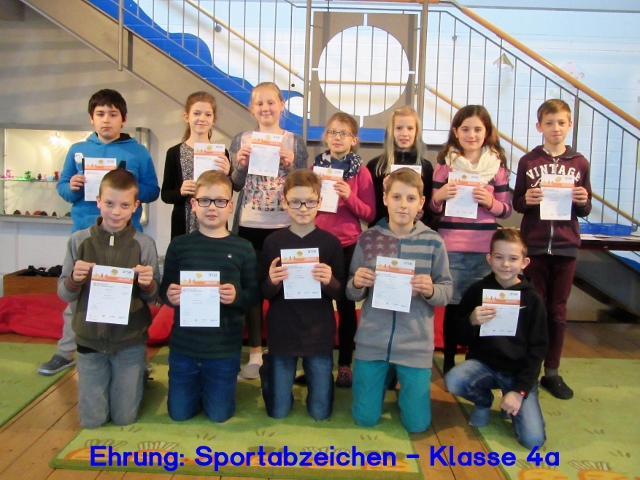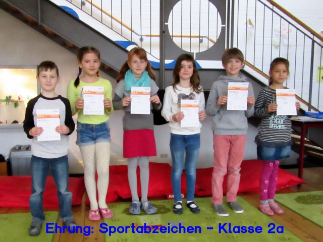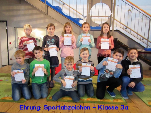 Am 24. Februar 2017 trafen sich alle Schülerinnen und Schüler der Klassenstufen 2, 3 und 4 in der Pausenhalle, um an einer Ehrungsveranstaltung teilzunehmen. Unter großem Beifall wurden zuerst die 62 Kinder mit einer Urkunde und einem Ansteck-Pin geehrt, die im Jahr 2016 an unserer Schule das Deutsche Sportabzeichen errungen haben.