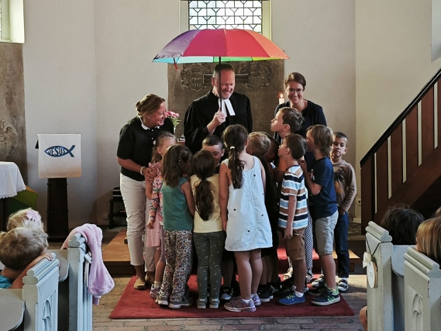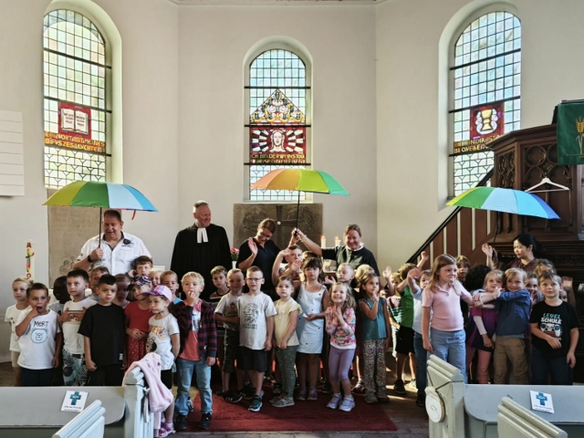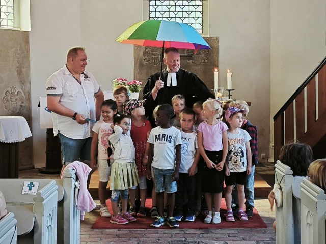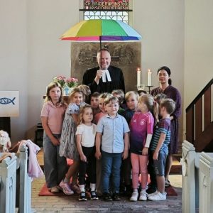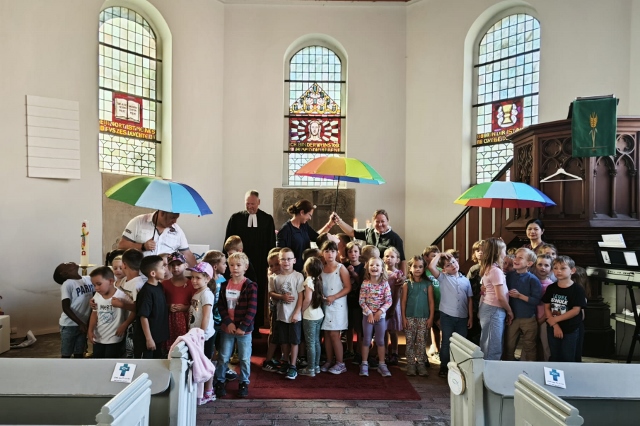 Am Ende dieses schönen Gottesdienstes wurden unseren Schulanfängern viele gute Wünsche zusammen mit einem kunterbunten Regenschirm mit auf den Weg gegeben, sodass sie gut beSCHIRMt durch ihre Schulzeit gehen können.