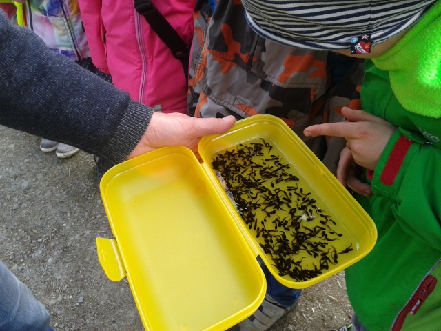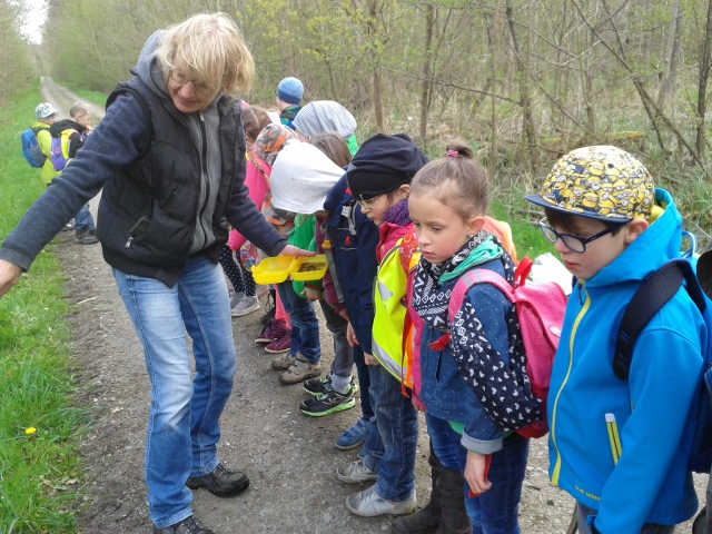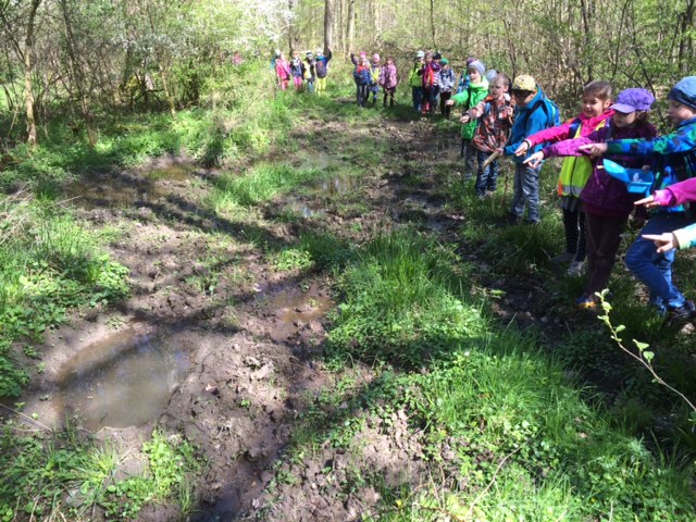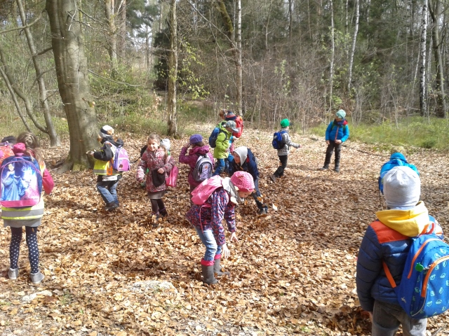 Dann ging es richtig in den Wald. Die Frühblüher standen in voller Blüte. Es gab große Teppiche mit Buschwindröschen und auch Veilchen und sogar Schlüsselblumen zu sehen. Auch Tiere wurden erspäht. So konnte ein flinkes Eichhörnchen, viele Schnecken und sogar ein Reh beobachtet werden. Am spannendsten allerdings waren die Spuren und Wechsel der Rehe, die Dachstoiletten und auch die Suhlen der Wildschweine, die an vielen Stellen zu entdecken waren. Und für die beiden Lehrerinnen war auch sehr interessant zu beobachten, wie sich manche Kinder recht schnell zu echten Naturentdeckern entwickelten.