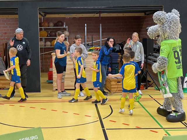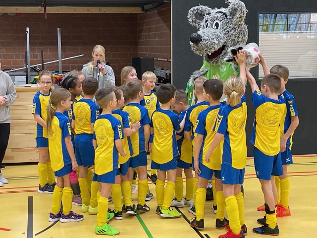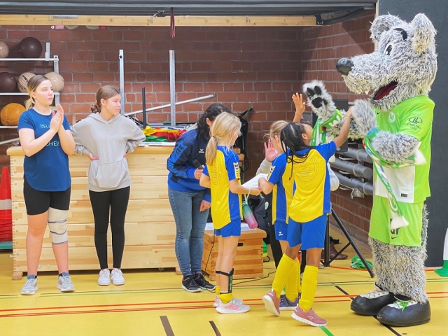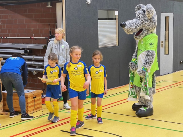 Nach drei aktionsreichen Stunden waren dann beide Turniere um ca. 11:30 Uhr beendet und alle unsere Jungs und Mädchen hatten ausreichend bewiesen, welch gute Fußballer und Fußballerinnen in Rötgesbüttel zu Hause sind. Bei der anschließenden Siegerehrung gab es dann noch für jeden Turnierteilnehmer unter großem Applaus ein kleines Geschenk, überreicht von „Wölfi“, dem Vereinsmaskottchen des VfL Wolfsburg. Am Ende waren alle Kinder gut drauf und froh dabei gewesen zu sein.