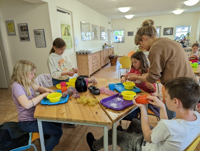 Vormittags nach Stallzeit und Frühstück gab es verschiedene Workshops, zum Beispiel Experimente zum Thema Energie, Filzen mit Wolle, Tierwohl oder Lebewesen im Bach. Auch leckere Schokobrötchen und Müsliriegel wurden selbst hergestellt. In der Mittagspause ging es dann auf einen der beiden schönen Spielplätze, außerdem wurden eifrig Kniffel, Kartenspiele und Werwolf gespielt. Auch das Essen war richtig lecker! Nach der Stallarbeit hatten ja auch alle einen Bärenhunger. Außerdem gab es jeden Nachmittag etwas Selbstgebackenes.