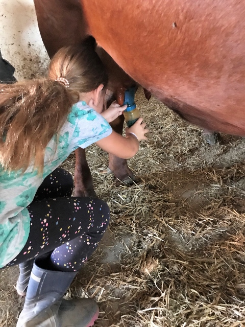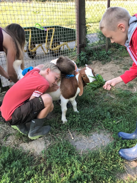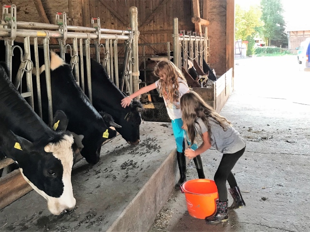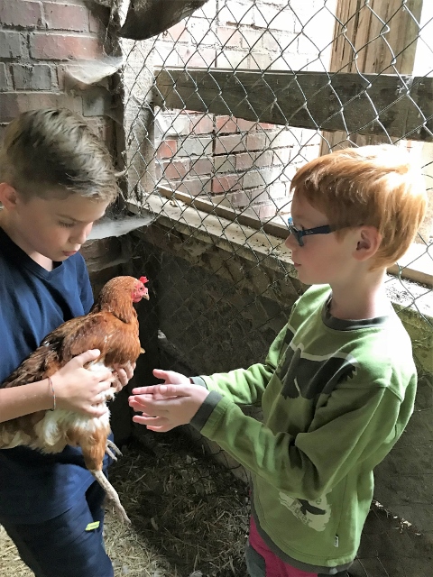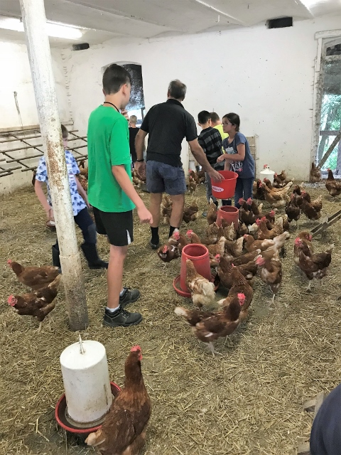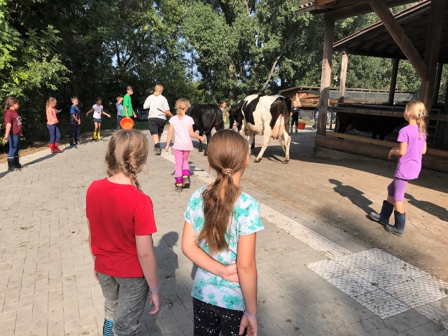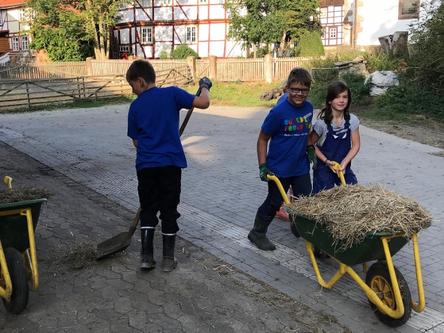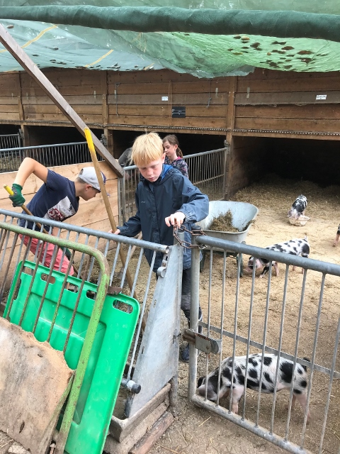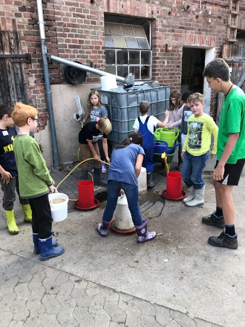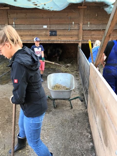 Das Vormittagsprogramm am Ankunftstag war natürlich etwas gekürzt. Aber nach dem Bettenbeziehen fuhr der Planwagen die beiden Klassen direkt ins Abenteuer Klassenfahrt. Auf dem Hof angekommen wurden alle herzlich von den zukünftigen Gruppenbetreuern begrüßt, die auch gleich ihre Tier-Arbeitsgruppen vorstellten: die Rinder-, Hühner- und Schweine-AG sowie die AG „Helden des Hofes. Die Schüler wählten eine Tier-AG, in der sie dann jeden Tag vormittags und nachmittags arbeiteten. Dazu gehörte das Zusammenstellen des Futters, dann das Füttern, Misten und das Einstreuen mit neuem Stroh und natürlich das Verteilen ganz vieler Streicheleinheiten. Die „Helden des Hofes“ versorgten die Gänse, Schafe und Ziegen. Und schon gleich am zweiten Tag hörten die Lehrerinnen von den Betreuern, dass sie schon fast überflüssig waren, denn in allen AGs wurden mit Eifer und großem Einsatz die zu erledigenden Arbeiten voll und ganz erfüllt.