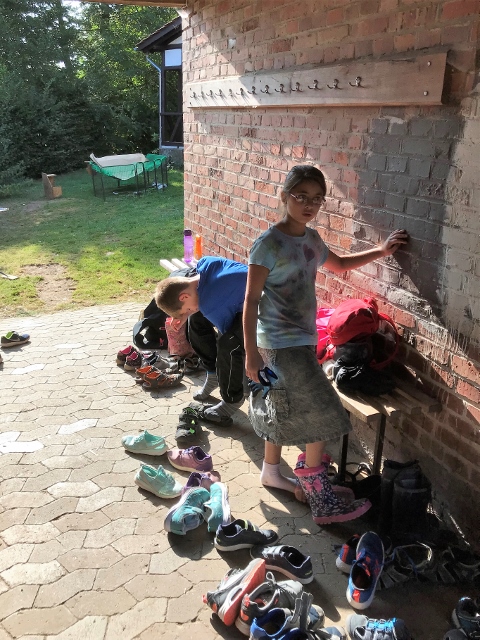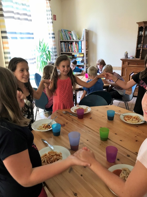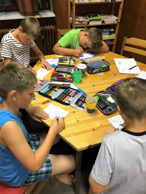 Nachdem dann alle gemeinsam im Speiseraum zu Abend gegessen hatten, wurden sie mit dem Planwagen wieder zurück zum Gästehaus gefahren. Dort sah das Abendprogramm wie folgt aus: duschen, Tagebuch schreiben, Spiele spielen und bettfertig machen. Danach versammelten sich jeden Abend alle Schüler reihum in einem anderen Zimmer. Hier las die Lehrerin noch eine Gute-Nacht-Geschichte vor.