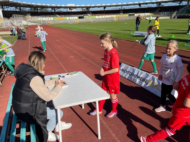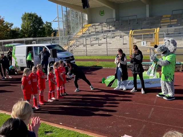 Doch auch abseits des Fußballplatzes gab noch einige schöne Aktionen wie z. B. ein Fototermin mit „Wölfi“ (Maskottchen des VfL Wolfsburg), eine Fragerunde mit zwei Bundesliga- und Nationalspielerinnen des VfL Wolfsburg mit anschließender Autogrammstunde und natürlich gab es auch noch ein paar nette kleine Geschenke für alle Teams.