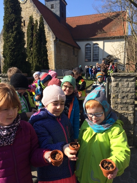 Zum Schluss bekamen alle unsere Schülerinnen und Schüler einen kleinen Blumentopf mit ausgesäten Kressesamen überreicht, um während der Osterferien selbst die Entstehung neuen Lebens beobachten zu können.
