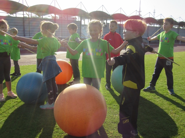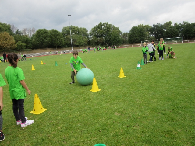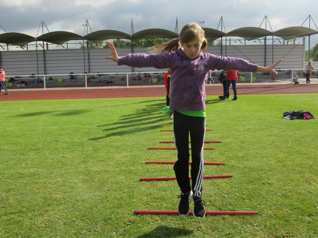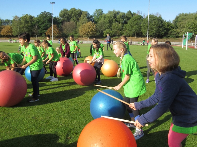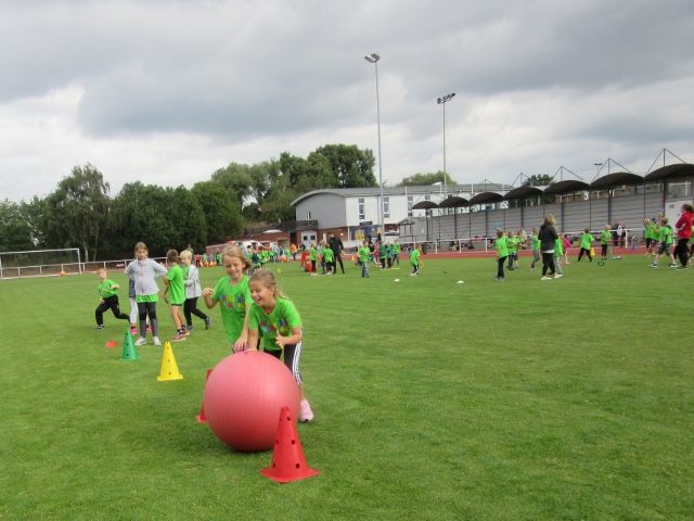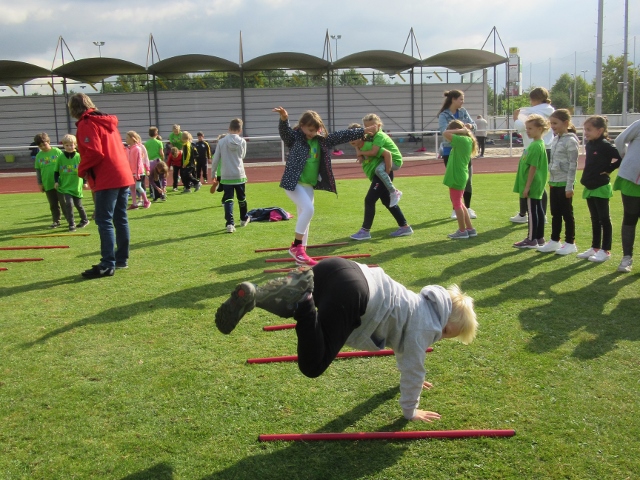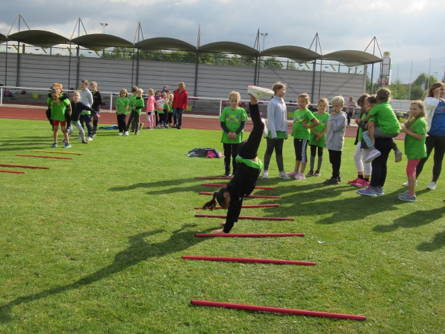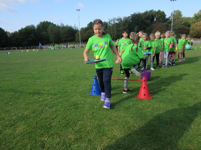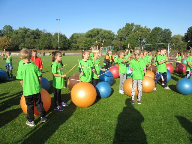 Alle Schulgruppen durchliefen verschiedene Bewegungsstationen – vom Trommeln auf Pezzibällen, Seilspringen und Geschicklichkeitsspielen bis hin zum Ringe fangen war alles dabei. Es gab auch eine Pendelstaffel, bei der jeweils fünf Schulen gemeinsam antraten.