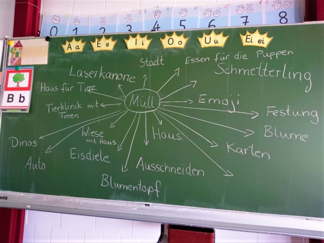 Gemeinsam wurden inspirierende Ideen als Mindmap an der Tafel gesammelt und dann ging es auch schon los: Mithilfe der Inspirationen wurden Planungsskizzen für die eigenen Recylingprojekte angelegt.