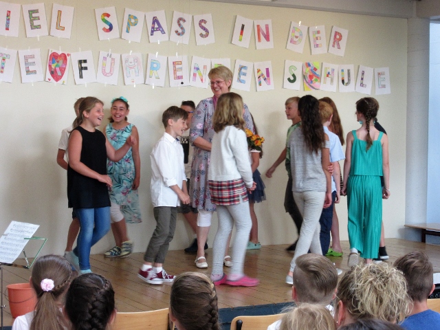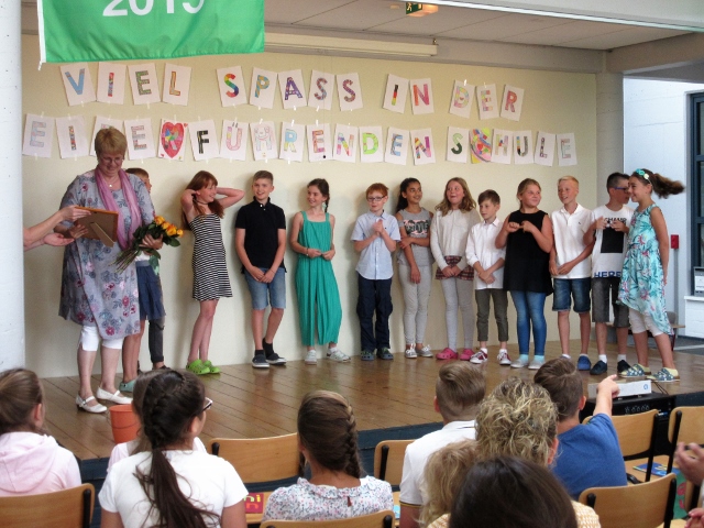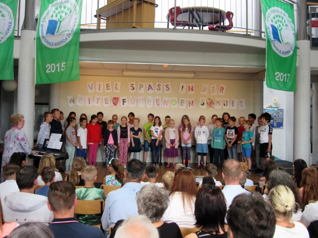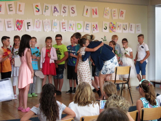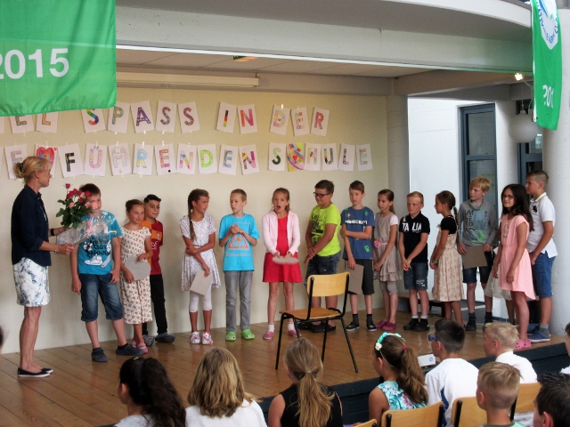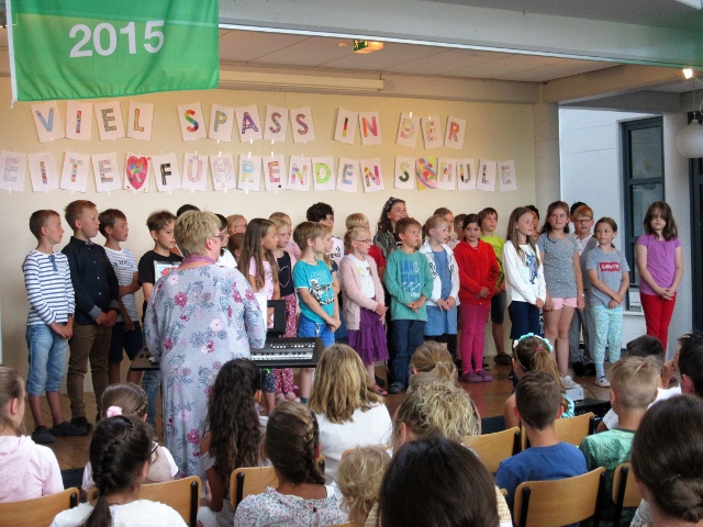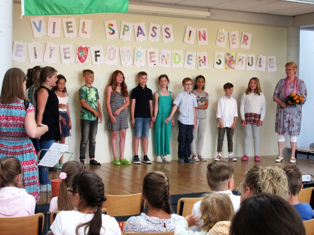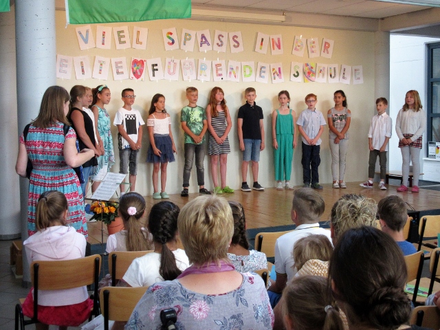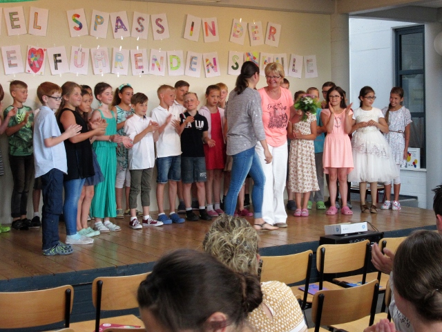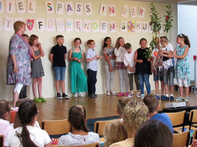 Wie jedes Jahr waren auch diesmal für die Ausgestaltung der Verabschiedungsfeier die 3. Klassen mit ihren Klassenlehrkräften zuständig. Gemeinsam mit unserer Schulchor-Leitung Frau Liebert wurde ein tolles Programm auf die Bühne gebracht. Es wurden lustige Sketche aufgeführt, schöne Gedichte vorgetragen, tolle Lieder gesungen und jede Menge Danksagungen dargebracht. Alle anwesenden Kinder, Eltern und Lehrkräfte waren gleichermaßen begeistert.