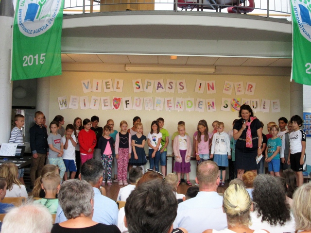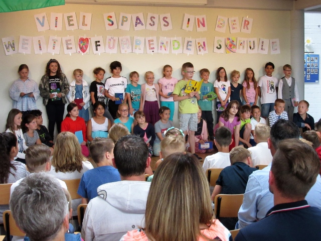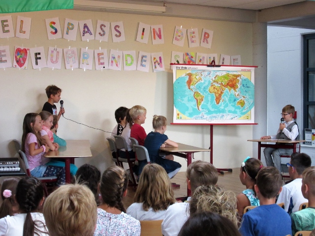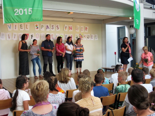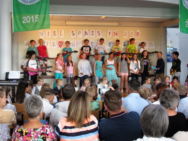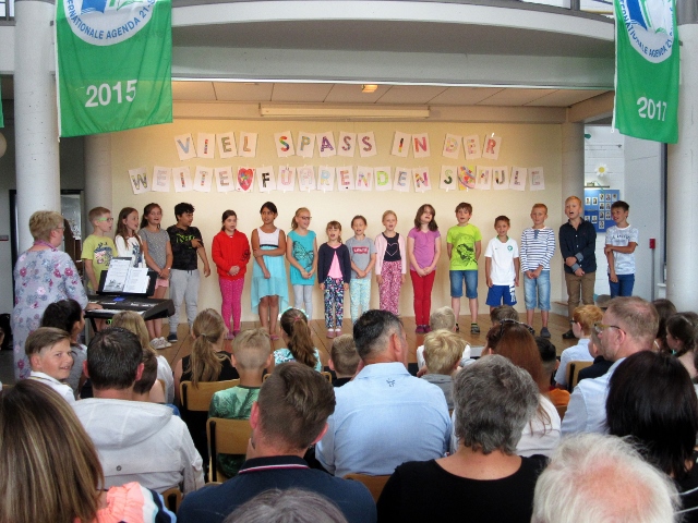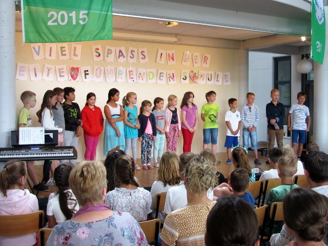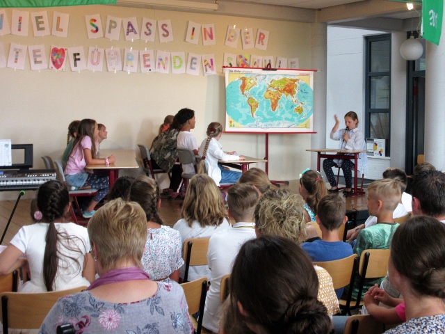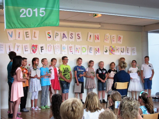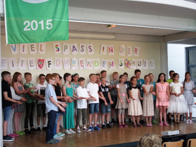 Wie jedes Jahr waren auch diesmal für die Ausgestaltung der Verabschiedungsfeier die 3. Klassen mit ihren Klassenlehrkräften zuständig. Gemeinsam mit unserer Schulchor-Leitung Frau Liebert wurde ein tolles Programm auf die Bühne gebracht. Es wurden lustige Sketche aufgeführt, schöne Gedichte vorgetragen, tolle Lieder gesungen und jede Menge Danksagungen dargebracht. Alle anwesenden Kinder, Eltern und Lehrkräfte waren gleichermaßen begeistert.