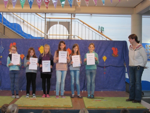 Nach einer kurzen Pause waren die Viertklässler an der Reihe, Ihr Können zu zeigen. Sechs Mädchen aus beiden vierten Klassen legten sich ordentlich ins Zeug und am Ende standen zwei neue Lesekönige fest: Lea G. für die dritten Klassen und Madita L. für die vierten Klassen.