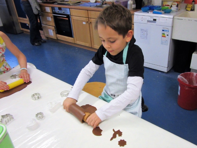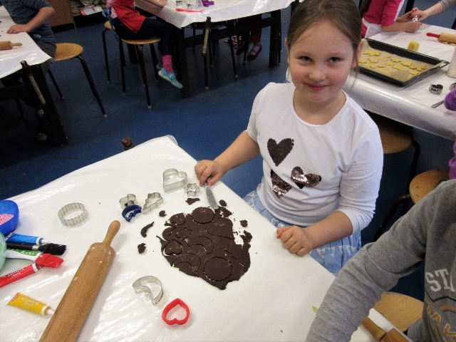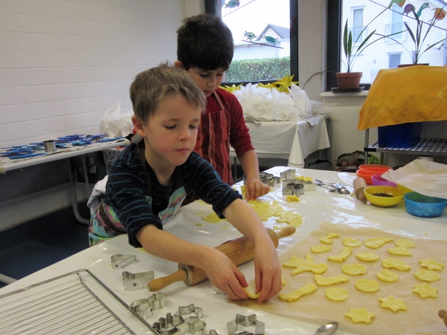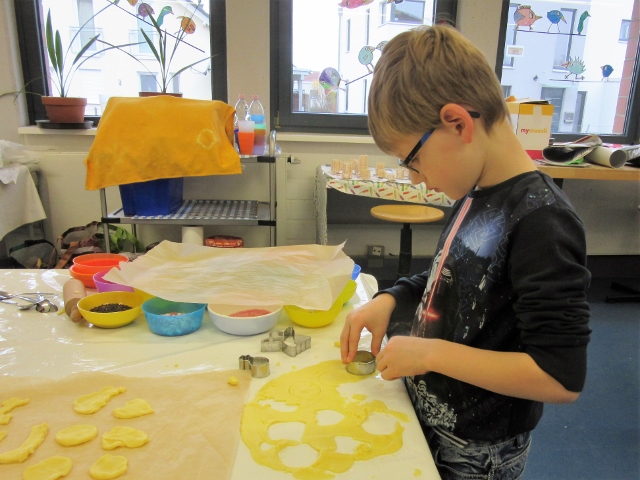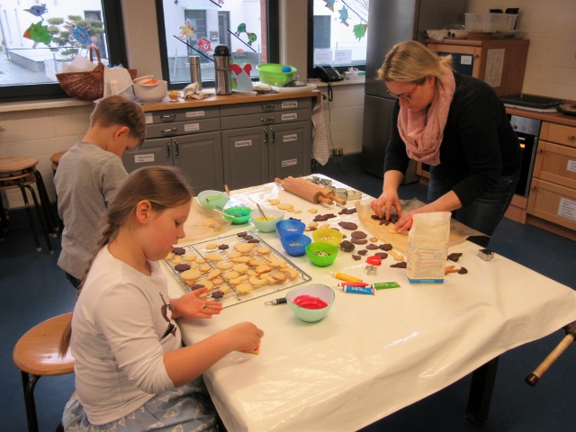 Hoch motiviert wurden die verschiedenen Teigsorten zuerst ordentlich durchgeknetet und sorgfältig ausgerollt, bevor im Anschluss die mitgebrachten Backförmchen zum Einsatz kamen. Die ausgestochenen Plätzchen wurden dann auf Backblechen verteilt und in den Backofen geschoben.